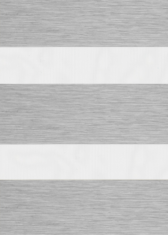 Jaluzea tip zebra cu benzi textile complet opace, nuanță gri-argintiu cu luciu fin satinat. Primul material opac din colecția noastră Day&Night, ideal pentru dormitoare sau spații unde se dorește întuneric total și design elegant.